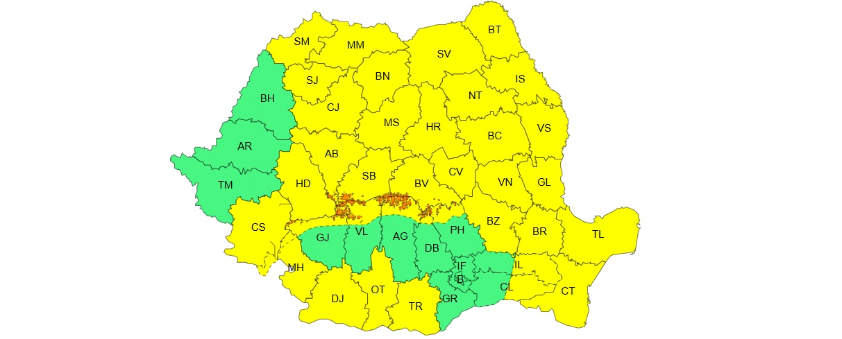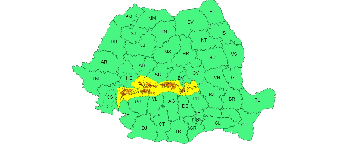 Tot miercuri, în Carpaţii Meridionali şi de Curbură, la altitudini mai mari de 1.600 de metri, va fi viscol puternic cu rafale de 110…130 km/h şi cu vizibilitate sub 50 de metri, aşa încât pentru aceste zone meteorologii au emis Cod portocaliu de vreme rea.