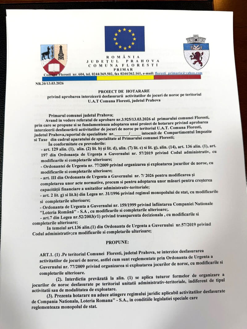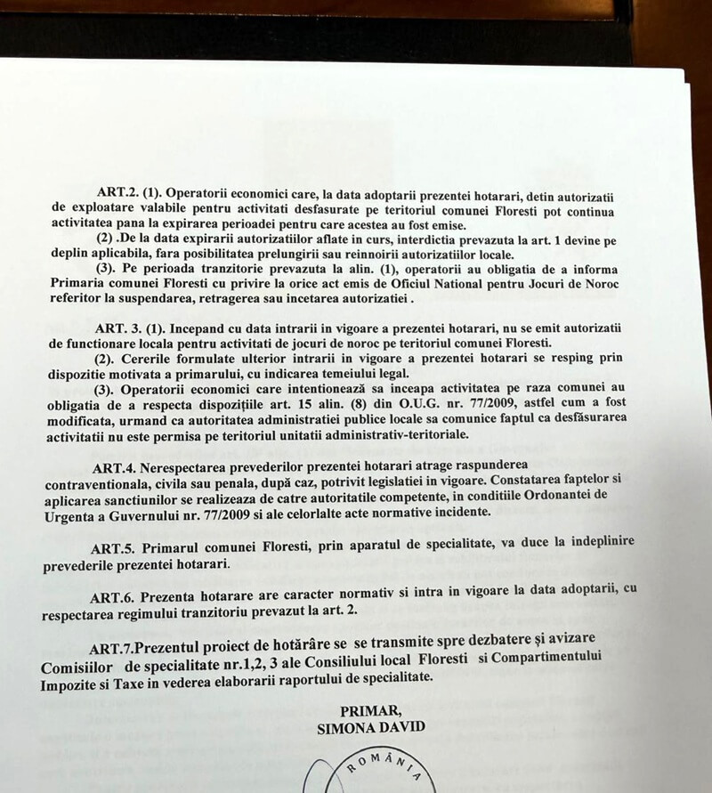 Totodată, de la data intrării în vigoare a hotărârii, administrația locală nu va mai emise autorizaţii de funcţionare locală pentru activităţi de jocuri de noroc pe teritoriul comunei Floreşti.