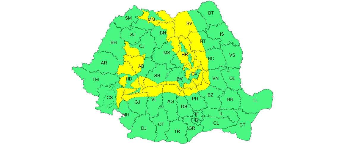 A doua avertizare cod galben este valabilă de luni seara, ora 21:00, până miercuri, ora 21:00. Vizează zona montană, în general la altitudini de peste 1.400 m.