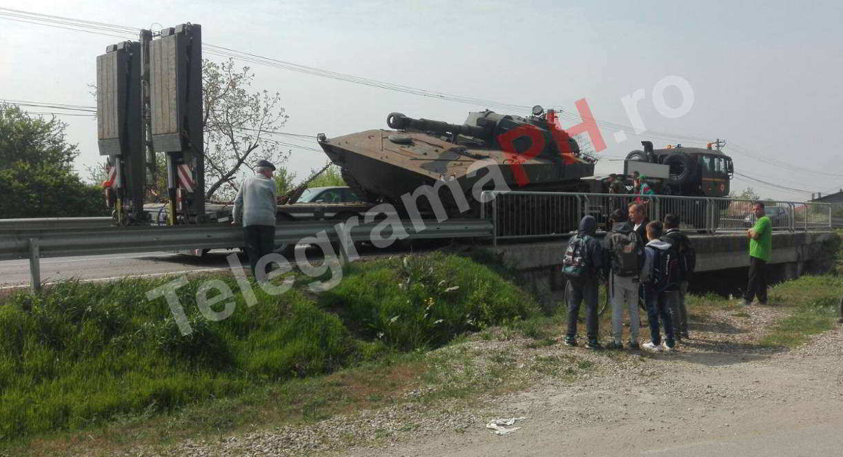 Incident ieşit din comun, miercuri în jurul prânzului, în localitatea prahoveană Loloiasca, unde un tanc care era transportat pe DN 1B s-a răsturnat. Vehiculul militar, aflat pe un trailer, s-a deplasat din spaţiul în care era ţinut şi a alunecat, oprindu-se în balustrada unui pod. Traficul rutier pe drumul care asigurîă legătura între Ploieşti şi Buzău a fost restricţionat.
