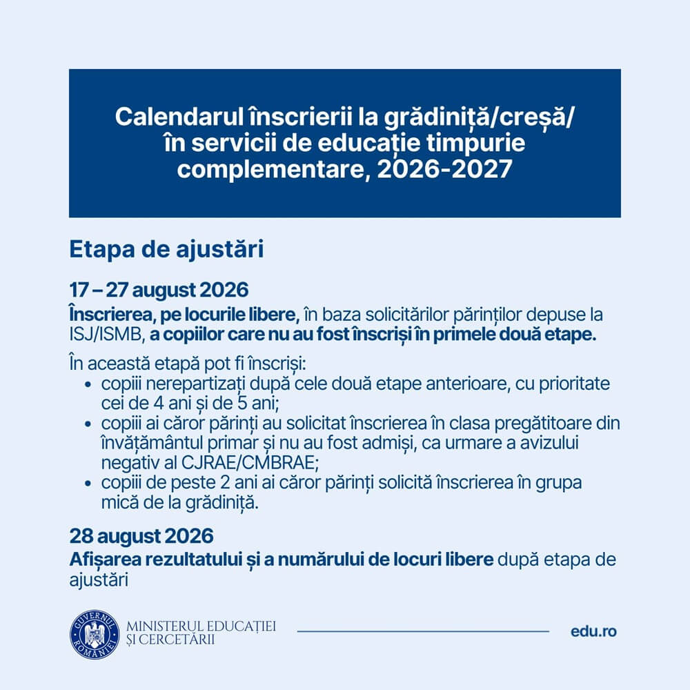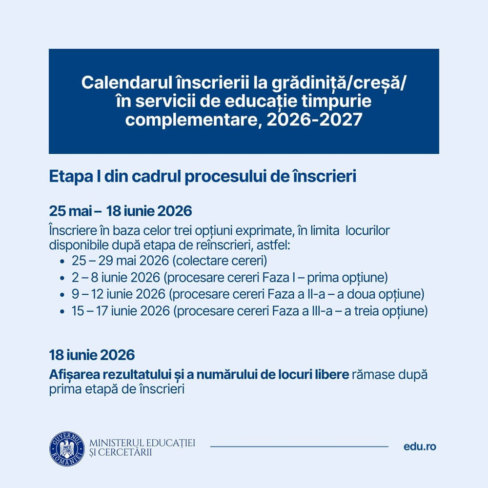 Ministerul Educației a stabilit și publicat calendarul valabil pentru înscrierile la creșă și grădiniță în anul școlar 2026 - 2027. Oficialii subliniază că solicitările nu vor fi aprobate în ordinea depunerii lor, ci pe baza criteriilor prevăzute de metodologie.