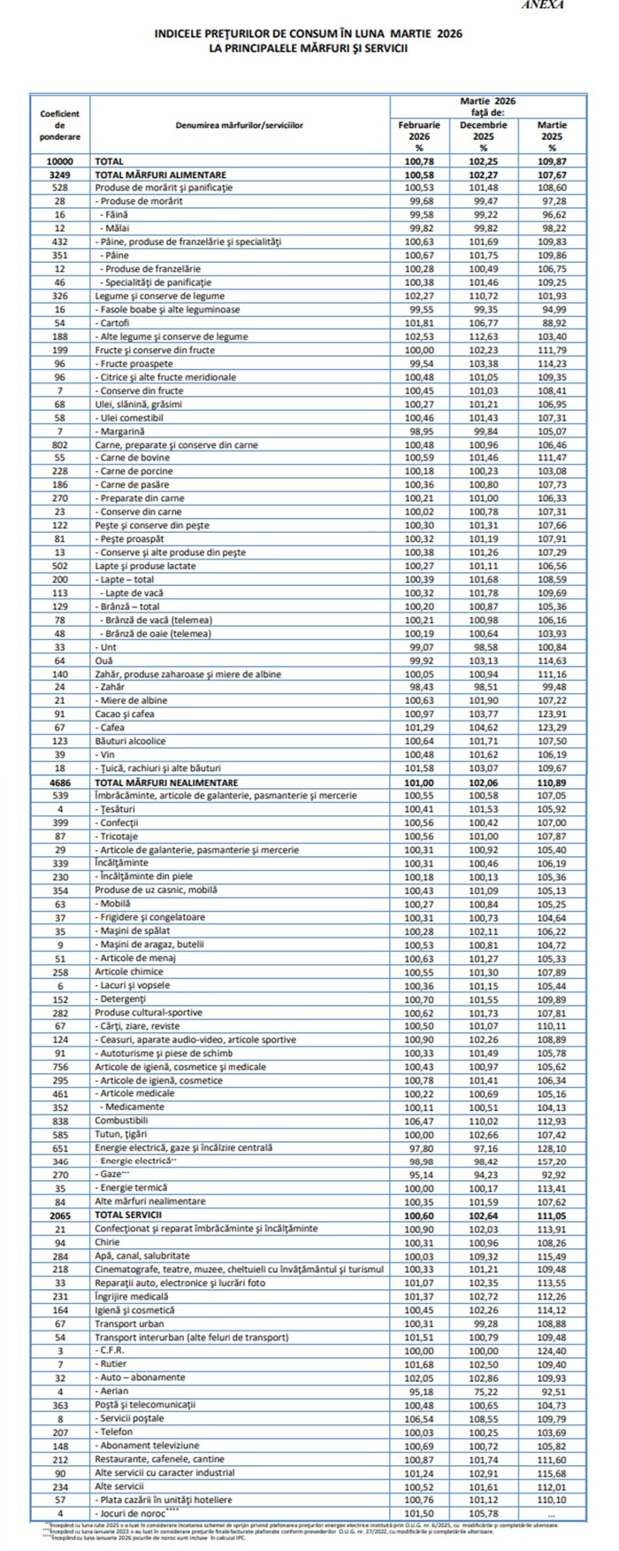 În raportul publicat miercuri, Institutul Național de Statistic arată că indicele preţurilor de consum în luna martie 2026 comparativ cu luna februarie 2026 a fost 100,78%. Rata inflaţiei de la începutul anului (martie 2026 comparativ cu decembrie 2025) a fost 2,3% și cea anuală, comparativ cu luna martie 2025, a fost 9,9%.
