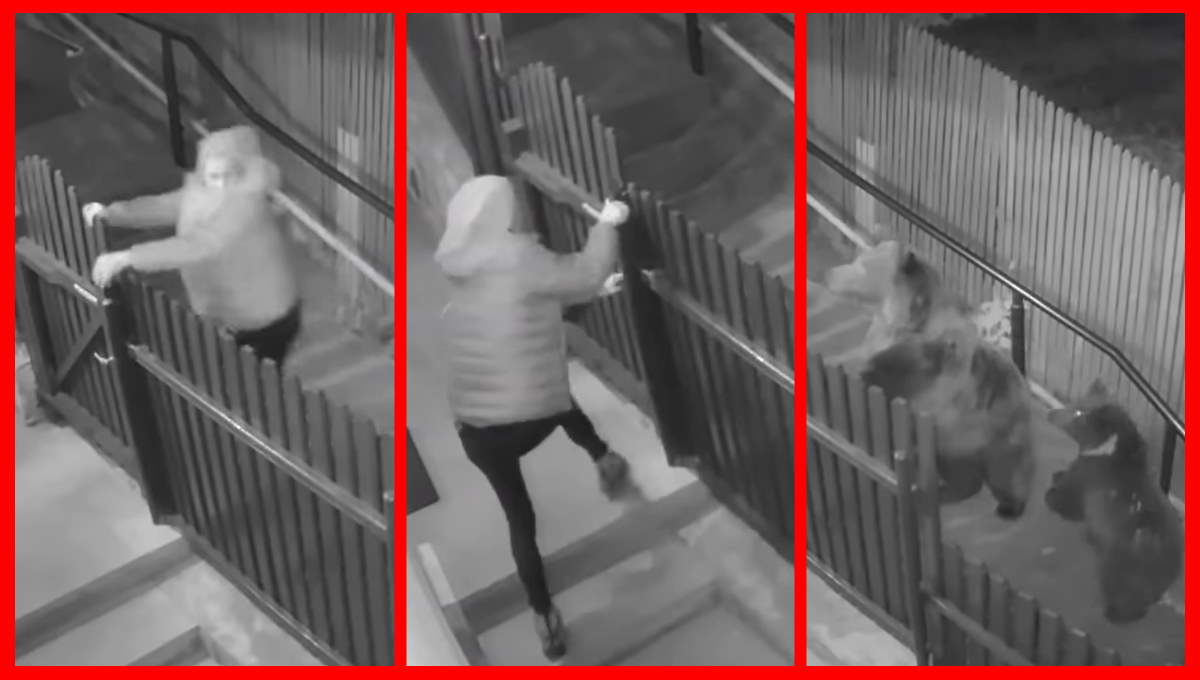 Evenimentul s-a petrecut pe 27 octombrie, în jurul orei 22.00, iar imaginile surprinse de o cameră de supraveghere au fost publicate pe rețelele de socializare. Înregistrarea arată cum, cu doar câteva secunde înainte ca doi urși să apară pe treptele din fața caselor, o familie cu un copil intră în imobil. Animalele coboară, iar, în urma lor, o femeie iese din clădire și pornește în aceeași direcție, fără să aibă vreo bănuială cu privire la pericolul aflat la câțiva metri în față. În scurtă vreme, aceasta se întoarce în fugă și reușește să intre înapoi în imobilul din care ieșire. În urma ei apar, imediat, și urșii.
